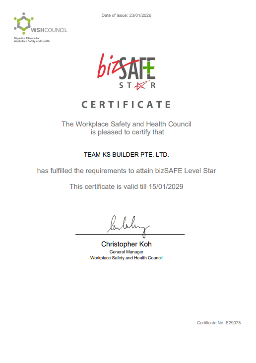 We are proud to announce that Team KS Builder Pte Ltd has achieved the prestigious bizSAFE Star Certification, the highest recognition in workplace safety and health. This certification reflects our unwavering commitment to maintaining a safe and healthy work environment, adhering to the strictest safety standards, and implementing a robust Workplace Safety and Health Management System